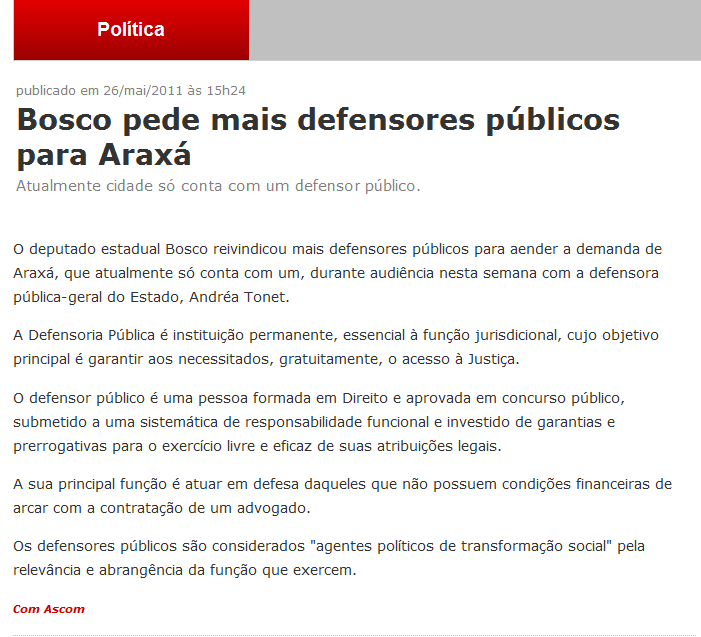 "Destaca-se, também, a finalização do VI Concurso Público para Ingresso na Carreira da Defensoria Pública, que elevará a composição do quadro de pessoal dessa instituição com mais 150 profissionais. A nomeação desses novos defensores, prevista para o início de 2011,vai difundir ainda mais a política de assistência jurídica ao hipossuficiente de Minas Gerais, bem como melhorar os atendimentos prestados."