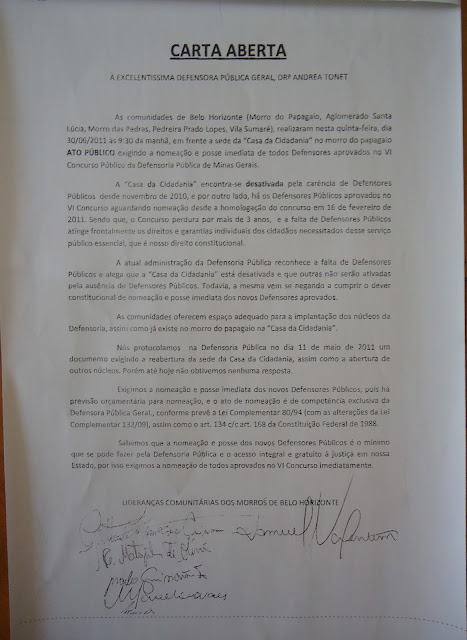 CARTA ABERTA DOS MORROS DE BH ENTREGUE À DEFENSORA GERAL NA REUNIÃO DO CONSELHO SUPERIOR NO DIA 01/07/2011 REIVINDICANDO A NOMEAÇÃO DOS DEFENSORES DO VI CONCURSO