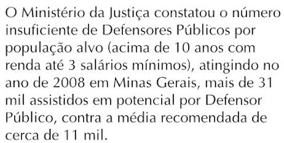 Além disso, das 296 comarcas existentes no Estado, somente 99 estão equipadas com esse serviço. A situação não só sobrecarrega os Defensores, como também compromete a qualidade do trabalho desenvolvido por eles, atrasa o andamento de processos que correm na Justiça e prejudica a população que depende dessa ajuda. (Fonte: Jornal Hoje em Dia- 14/04/2011)